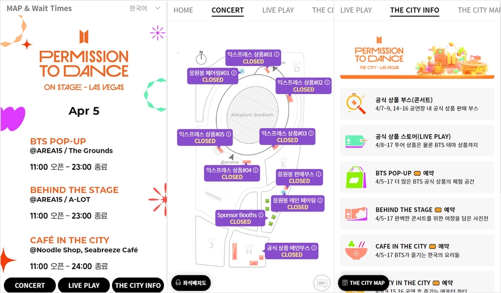 '맵 앤드 웨이트 타임즈'(MAP & WAIT TIMES)라는 이름의 이 서비스는 콘서트·라이브플레이 공연장 지도, 방탄소년단 관련 이벤트를 가리키는 '더 시티'(THE CITY) 전체 지도, 주요 판매 시설 대기 정보, 모든 시설·프로그램 리스트, 온라인 링크 등을 제공한다.