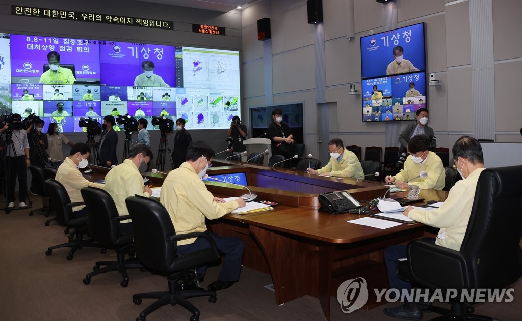 | ▲ Prime Minister Han Duck-soo (C, head of table) presides over an emergency meeting at the government complex in Seoul on Aug. 11, 2022, to check countermeasures against record torrential rain in the country. (Yonhap) |