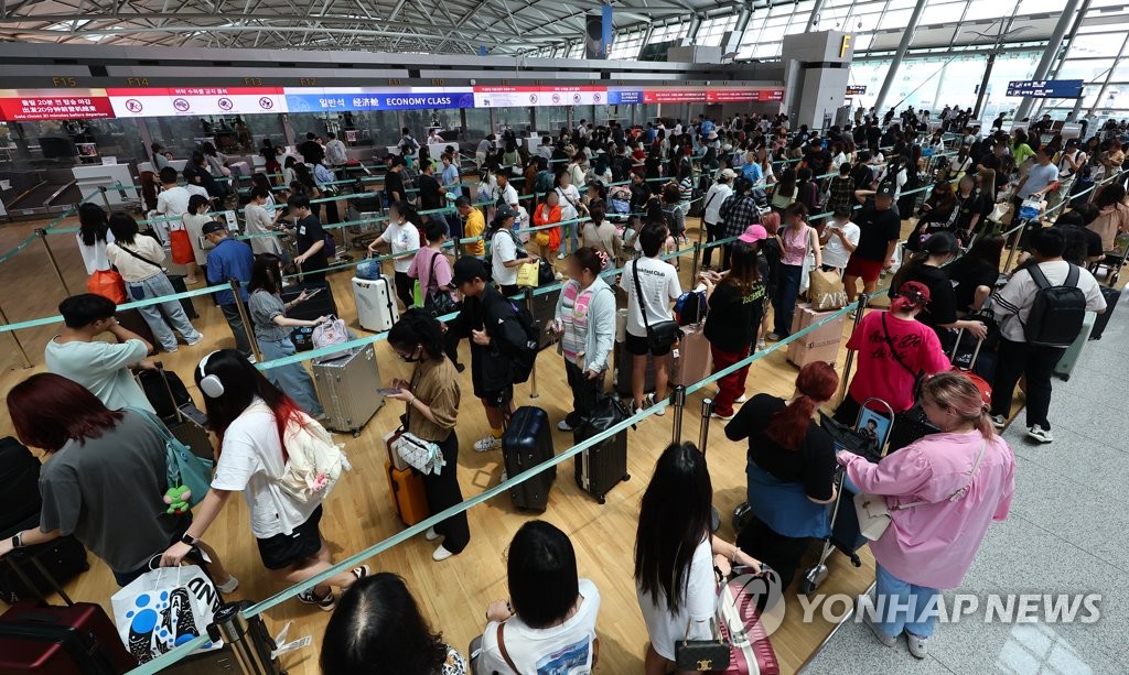 | ▲ 여름 성수기 맞아 붐비는 인천공항 (영종도=연합뉴스) 서대연 기자 = 24일 오후 인천국제공항 제1여객터미널 출국장이 이용객으로 북적이고 있다. 인천국제공항공사는 올해 여름철 성수기 3주간(7월25일∼8월15일) 인천공항 이용객이 391만8천855명, 하루평균으로 치면 17만8천130명이 될 것으로 전망했다. 이는 코로나19로 해외여행이 일부 제한됐던 작년 여름철 성수기(하루 6만2천983명)보다 3배 가량 늘어난 수치다. 2023.7.24 dwise@yna.co.kr |