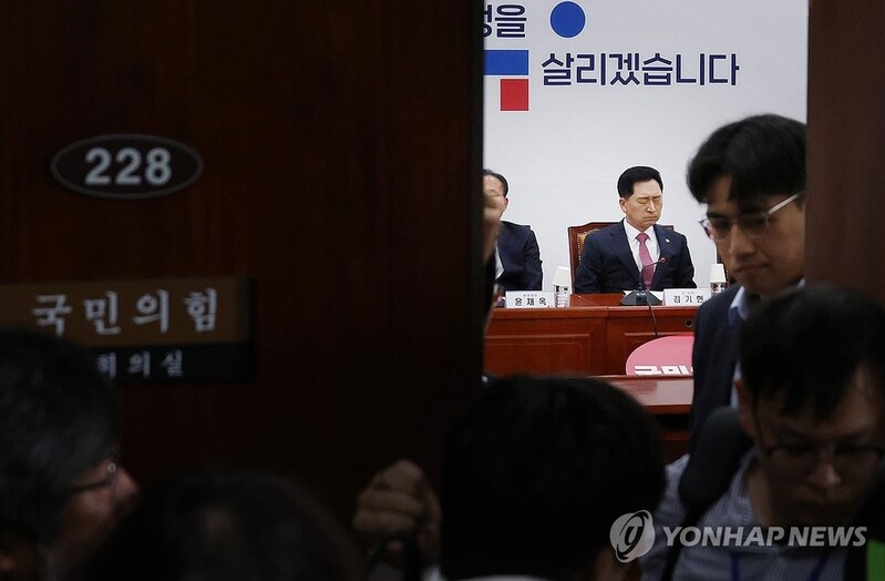 | ▲ Ruling People Power Party leader Kim Gi-hyeon is seen attending a party leadership meeting as the venue's door is being closed at the National Assembly in Seoul, on Oct. 12, 2023. (Yonhap) |