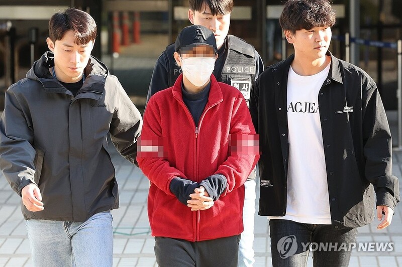 | ▲ Police officers escort a man out of a court in Seoul on Oct. 16, 2023, following a court hearing on suspicions of leaving a weapon in front of Justice Minister Han Dong-hoon's home in southern Seoul. (Yonhap) |