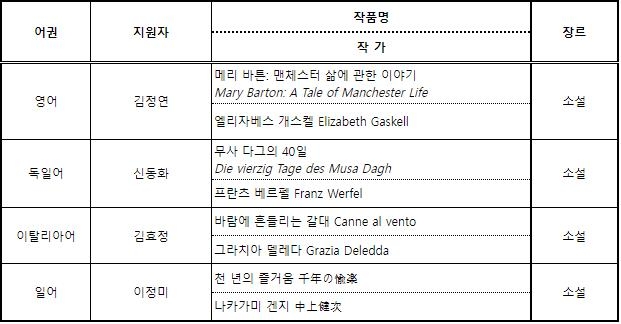 이번 지원 대상은 영어권인 엘리자베스 개스켈의 '메리 바튼: 맨체스터 삶에 관한 이야기'와 독일어권인 프란츠 베르펠의 '무사 다그의 40일', 이탈리아어권인 그라치아 델레다의 '바람에 흔들리는 갈대', 일본어권인 나카가미 겐지의 '천 년의 즐거움' 등 4개 언어권 네 작품이다. 이들 소설은 모두 국내 초역이다.