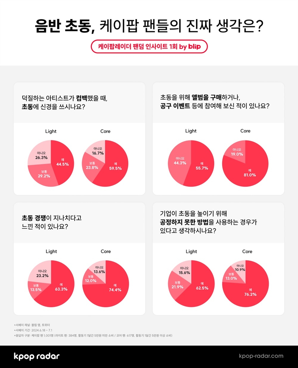 K팝 코어팬들은 '덕질하는 아티스트가 컴백했을 때 초동에 신경을 쓰느냐', '초동 경쟁이 팬덤 내 스트레스를 유발한다고 생각하느냐', '초동을 위해 앨범을 구매하거나 공구 이벤트 등에 참여해본 적이 있느냐' 등의 질문에 과반이 '그렇다'고 답했다.