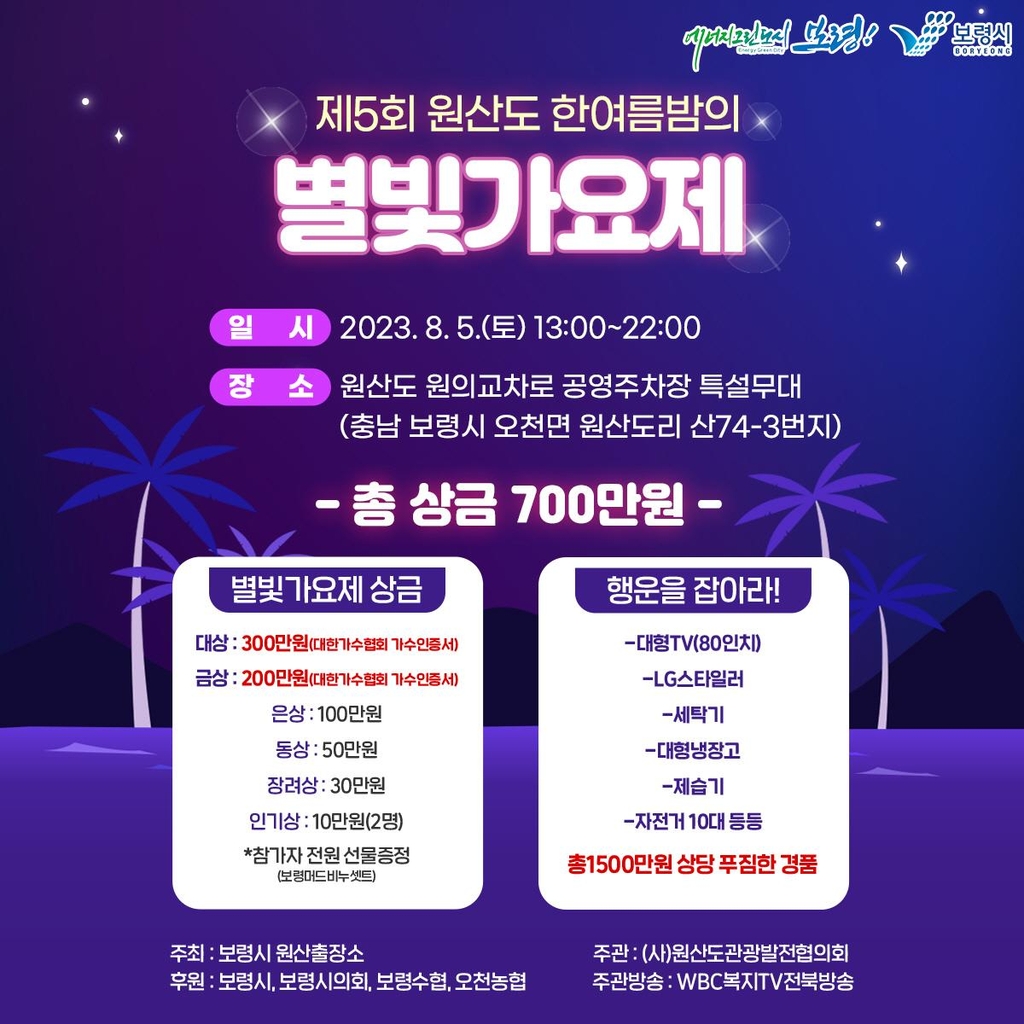 (보령=연합뉴스) 정찬욱 기자 = 충남 보령시는 오는 8월 5일 원산도 원의 교차로 공영주차장 특설무대에서 국민 노래자랑인 '제5회 원산도 한여름 밤의 별빛가요제'를 연다고 21일 밝혔다.