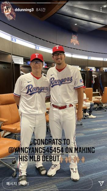 더닝은 29일(한국시간) 자신의 인스타그램 스토리에 "양현종의 메이저리그 데뷔를 축하합니다"라는 메시지를 올렸다.
