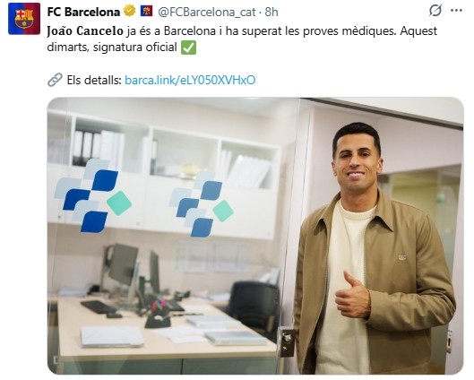 | ▲ 주앙 칸셀루의 입단 예정 소식을 전한 바르셀로나 구단. [바르셀로나 구단 SNS. 재판매 및 DB 금지] |
