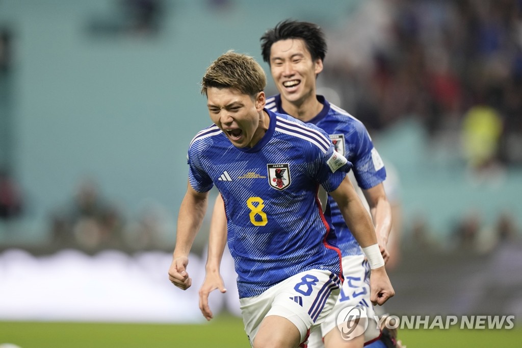 | ▲ 독일전서 골 넣고 포효하는 일본 축구대표팀 도안 리쓰 (도하 AP=연합뉴스) 일본 축구대표팀의 도안 리쓰(가운데)가 지난 23일(현지시간) 카타르 알라이얀의 할리파 인터내셔널 스타디움에서 열린 2022 카타르 월드컵 조별리그 E조 독일과의 경기 후반 30분에 골을 터뜨린 후 기뻐하고 있다. 이날 일본은 독일에 2-1 역전승을 거뒀다. 2022.11.24 ddy04002@yna.co.kr |