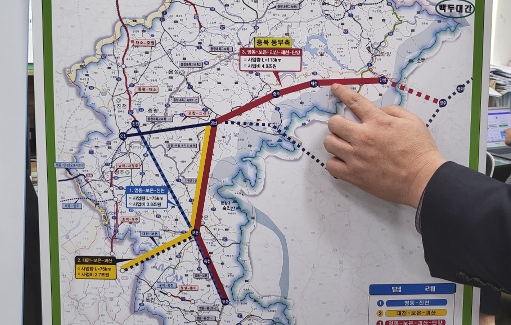 도는 구체적으로 ▲ 영동에서 진천(75㎞·사업비 3조8천억원)까지 국가계획에 반영된 남북6축 고속도로 조기 건설 ▲ 대전∼보은의 방사축 국가계획을 괴산까지 연장(76㎞·사업비 2조7천억원) ▲ 괴산∼제천∼단양 연결구간(41㎞·사업비 2조원)의 국가계획 반영 등이 대선 공약에 포함돼야 한다고 설명했다.