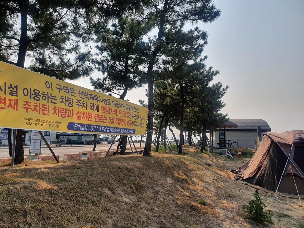 시는 이곳에도 공유수면 관리 및 매립에 관한 법률에 따라 주차된 캠핑카와 설치된 텐트를 치워달라고 현수막을 내걸었다.