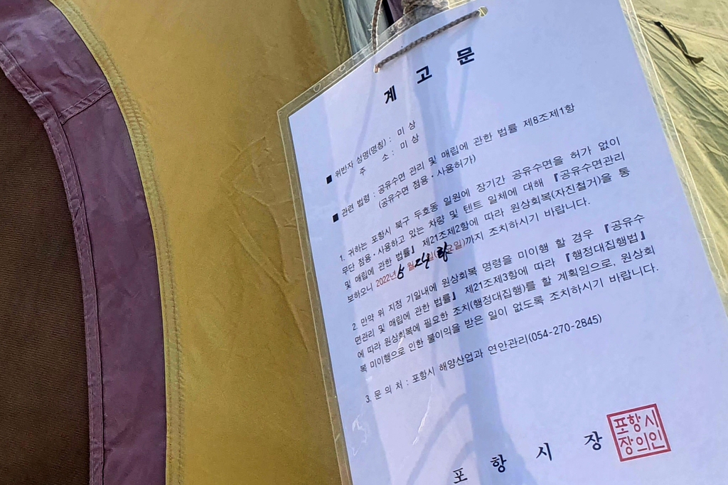 | ▲ 23일 포항 공유수면에 장기간 불법 설치된 텐트에 계고장이 붙어있다 [촬영 손대성] |