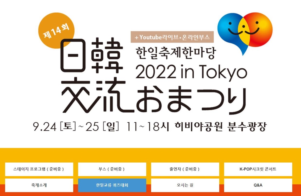 (서울=연합뉴스) 강성철 기자 = 한일축제한마당2022실행위원회는 9월 24∼25일 도쿄 히비야(日比谷) 공원에서 열리는 '한일축제한마당 2022 in Tokyo'의 주요 행사 중 하나인 '한일 교류 퀴즈대회' 참가자를 모집한다고 19일 밝혔다.
