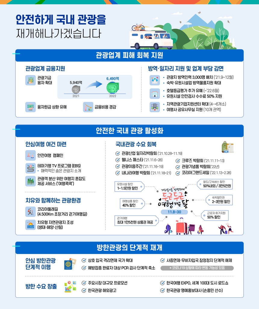 국내 여행객의 교통비·숙박비를 할인해주는 '2021 여행가는 달' 행사를 30일까지 열고 '내나라여행박람회'와 '관광산업일자리박람회', '웰니스페스타' 등 관광 관련 박람회도 잇따라 개최할 예정이다. 내년 초에는 '2022 코리아그랜드세일'이 이어진다.