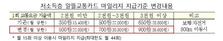 이달부터 저소득층 알뜰교통카드는 할인을 확대한다. 마일리지 지급 기준 월 상한을 1회 교통요금 지출액별로 150∼250원 늘리는 방식이다.