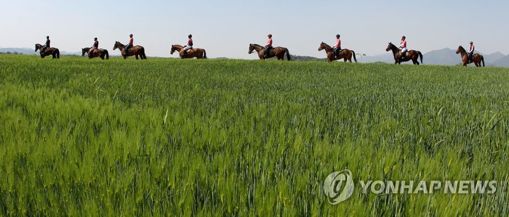 | ▲ 봄처럼 푸른 청보리밭 (함안=연합뉴스) 어린이날인 5일 오전 경남 함안군 함안강나루생태공원 내 청보리밭을 함안경마장 관계자들이 말을 탄 채 지나고 있다. 2019.5.5 [함안군 제공] home1223@yna.co.kr |