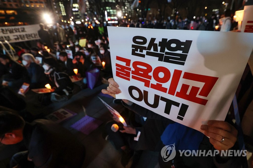 | ▲ Social activists supporting the victims of Japan's wartime forced labor condemn the compensation plan announced by the government of President Yoon Suk Yeol, holding signs that read "Yoon Suk Yeol humiliating diplomacy out!" in central Seoul on March 6, 2023. (Yonhap) |