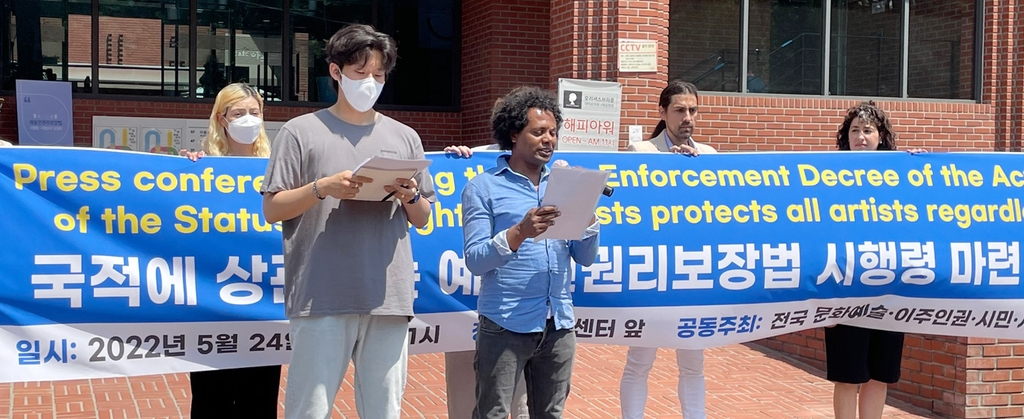 | ▲ 국적에 상관없는 예술인권리보장법 시행령 촉구 기자회견 (서울=연합뉴스) 한국다양성예술가협회의 상임대표인 에티오피아 출신 베레켓 알레마예후(오른쪽) 상임대표가 지난 5월 24일 대학로에서 '국적에 상관없는 예술인권리보장법 시행령 마련을 위한 기자회견'을 하고 있다. [한국다양성예술가협회 제공. 재판매 및 DB 금지] |