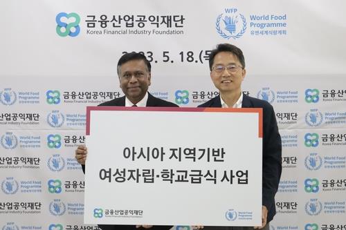 | ▲ This photo provided by the World Food Programme's Seoul office on May 21, 2023, shows Abdur Rahim Siddiqui (L), Sri Lankan representative for WFP, after reaching an agreement with the Korea Financial Industry Foundation on a contribution to the WFP Sri Lanka Home Grown School Feeding project. (PHOTO NOT FOR SALE) (Yonhap) |