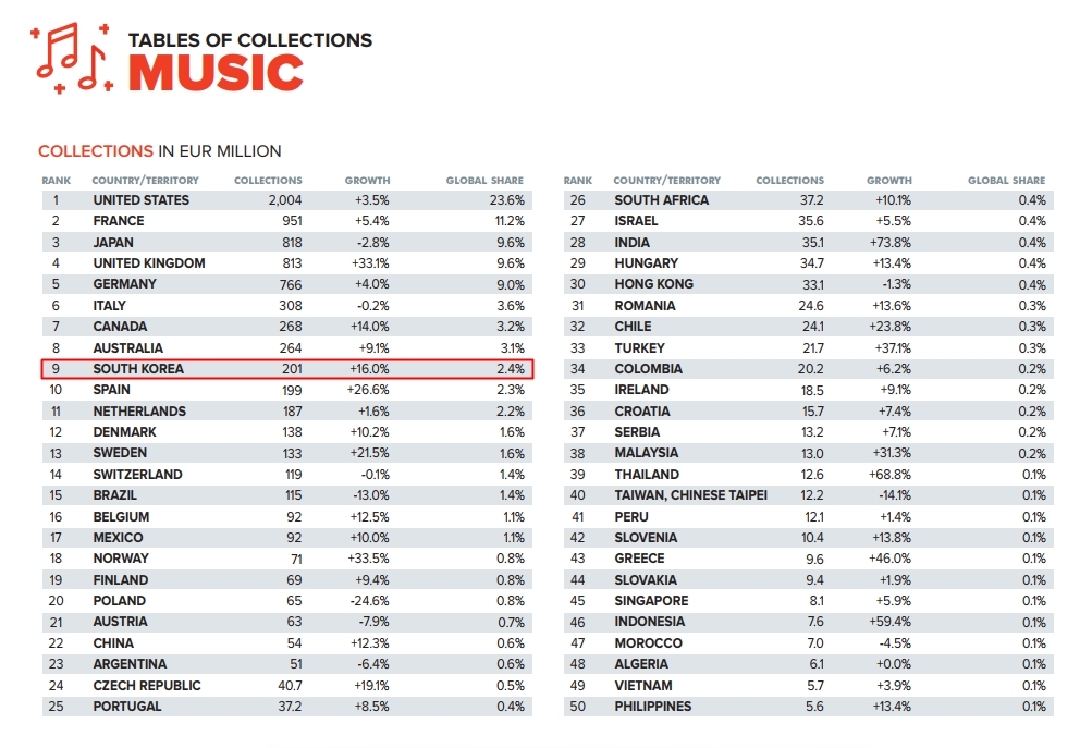 작년 한국 음악 저작권료 징수 세계 9위…한 계단 상승