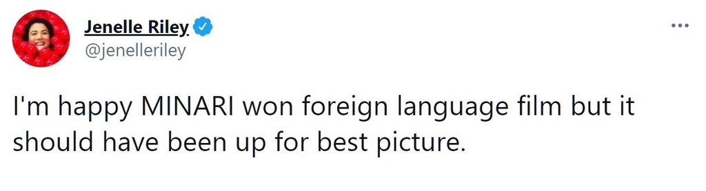 | ▲ 골든글로브가 미나리를 작품상 후보에서 배제한 것을 꼬집은 누리꾼 [트위터 게시물 캡처·재판매 및 DB 금지] |