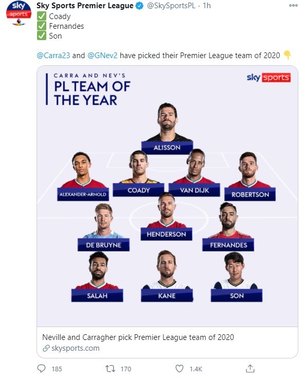스카이스포츠는 22일(한국시간) 축구 해설가로 활동하는 게리 네빌과 제이미 캐러거가 뽑은 'EPL 올해의 팀'을 공개했는데, 손흥민은 4-3-3 포메이션의 왼쪽 측면 공격수로 자리했다.