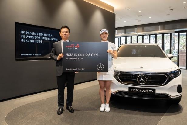 (서울=연합뉴스) 박성민 기자 = 메르세데스-벤츠 공식 딜러 한성자동차는 한국여자프로골프(KLPGA) 정규 투어 대회에서 3년 연속 홀인원을 기록한 인주연(25) 선수에게 홀인원 부상인 순수 전기차 '더 뉴 EQA'를 전달했다고 3일 밝혔다.