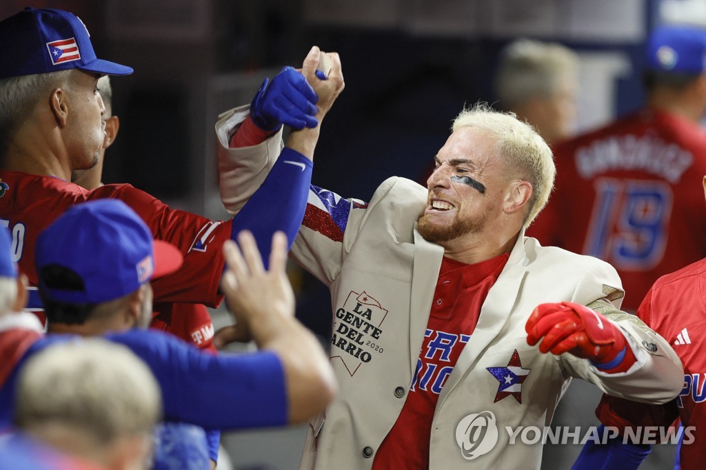 | ▲ 포효하는 린도르 (마이애미 AP=연합뉴스) 푸에르토리코의 린도르가 16일(한국시간) 미국 플로리다주 마이애미 론디포파크에서 열린 2023 WBC 1라운드 D조 도미니카공화국과의 경기에서 5회초 상대 실책으로 홈을 밟은 뒤, 동료들의 축하를 받고 있다. |