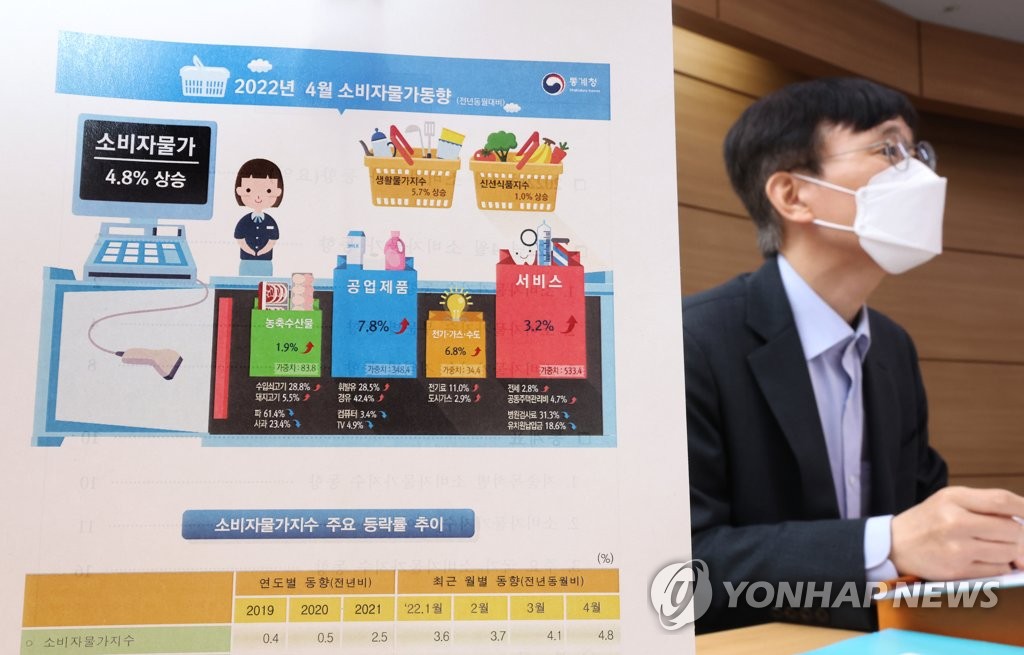 ▲ Eo Woon-seon, a senior official at Statistics Korea, holds a press conference at the government complex in Sejong, central South Korea, on May 3, 2022, to announce that consumer prices spiked 4.8 percent from a year earlier in April, rising at the fastest pace in more than 13 years amid soaring energy costs caused by Russia's war with Ukraine and a rebound in demand from the pandemic. (Yonhap)