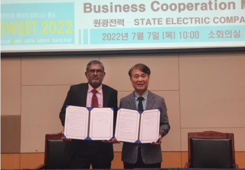 (해남=연합뉴스) 조근영 기자 = 신재생에너지 선도기업인 원광전력(대표 전연수)은 광주광역시 주최, 'SWEET 2022' 국제 전시회에서 몰디브 국영전력사(STELCO)와 신재생에너지 공동사업 업무 협약을 체결했다고 11일 밝혔다.