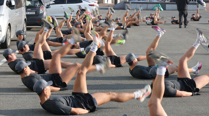 Members of the Navy's elite Sea Salvage and Rescue Unit warm up in shorts at a naval port in the southeastern city of Changwon on Jan. 17, 2025, as part of their cold weather exercise. (Yonhap)