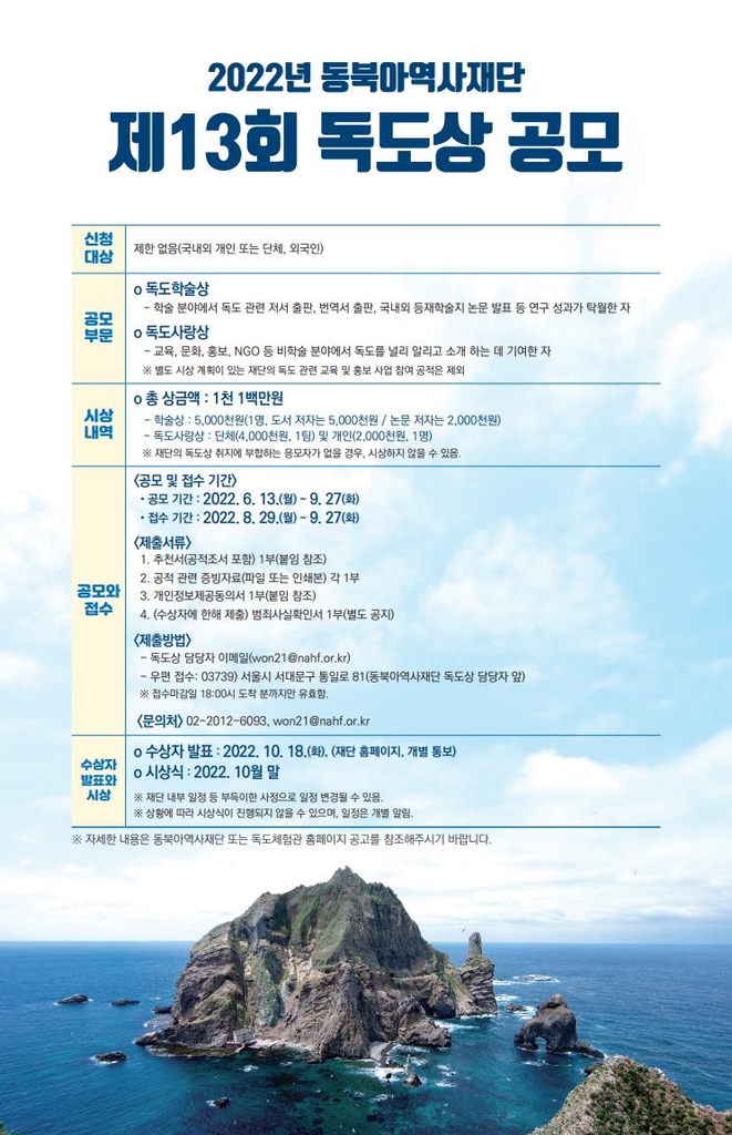 ▲ 동북아역사재단, 독도상 후보자 공모 = 동북아역사재단은 독도상 수상 후보자를 9월 27일까지 공모한다.
