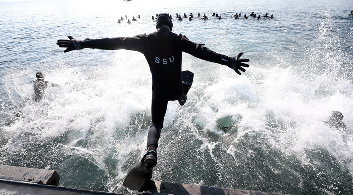 Members of the Navy's elite Sea Salvage and Rescue Unit jump into the sea off a naval port in the southeastern city of Changwon on Jan. 17, 2025, as part of their cold weather exercise. (Yonhap)