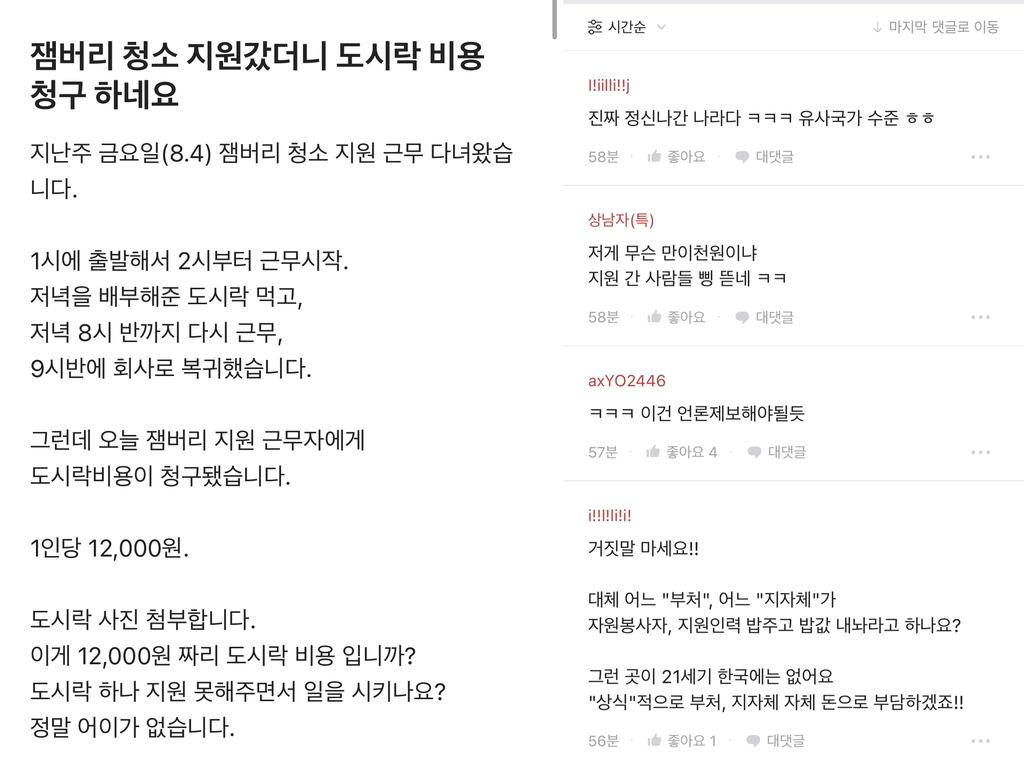 누리꾼들은 '하다 하다 이제 자원봉사자와 동원된 직원에게 돈을 내라니 말이 안 나온다', '진짜 너무 상식 밖이라 믿기지 않는다', '편의점 4천원짜리 도시락보다 부실한데 1만2천원은 누가 책정한 가격이냐?' 등 비판의 목소리를 높였다.