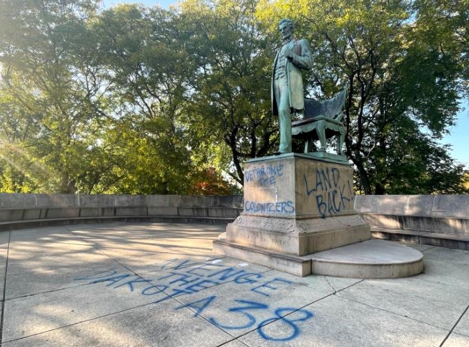 동상 어깨에 붉은색 페인트가 뿌려졌고 동상 받침대에 '식민주의자들을 퇴출하라', '원주민 땅을 다시 원주민에게' 등의 구호와 함께 바닥에 '다코타 원주민 38명을 위한 복수'라는 문구가 낙서됐다.