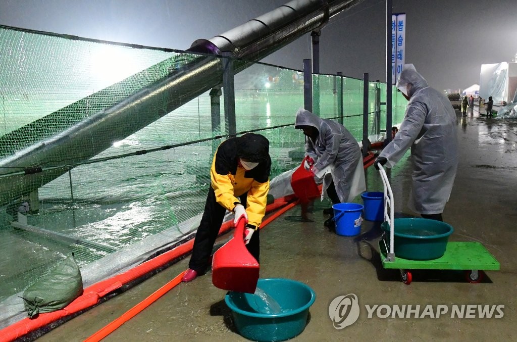 100m에 달하는 대형 눈 조각 작품을 보호하고자 비닐을 씌우는 한편 축제장 내 빗물 제거 작업을 벌이고 있다.