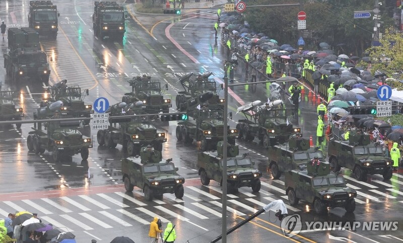 | ▲ A military parade is under way in downtown Seoul amid rain on Sept. 26, 2023, involving long-range surface-to-air missiles, Hyunmoo missiles and missile defense system, in commemoration of the 75th anniversary of Armed Forces Day. |