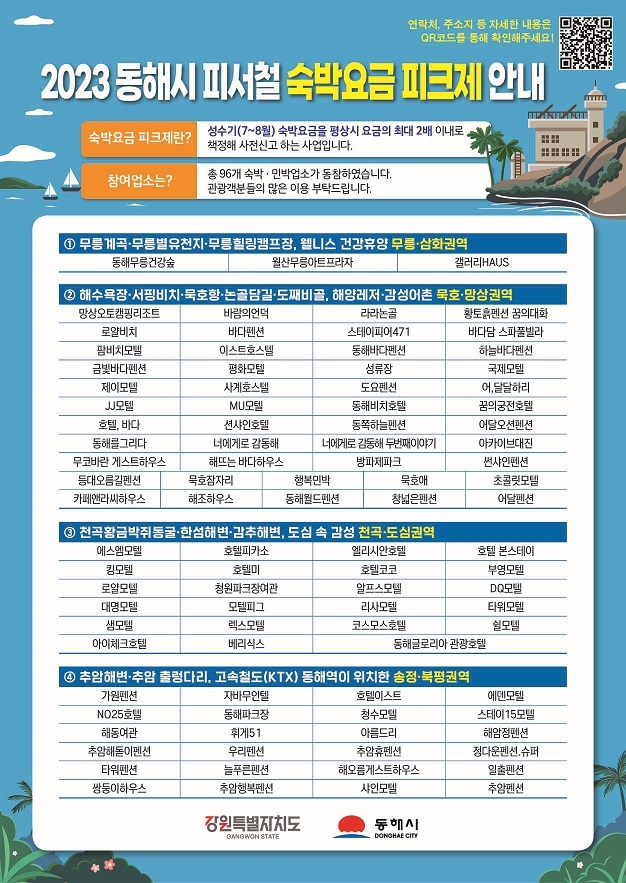 피서철 숙박 요금 피크제는 숙박업 경영자가 7∼8월 성수기 숙박 요금을 비수기에 해당하는 평소 숙박 요금의 2배 이내로 인상해 적용한 숙박 요금을 동해시에 사전 신고하는 사업이다.