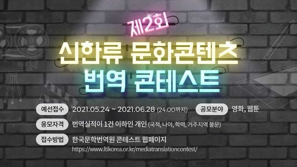 (서울=연합뉴스) 이승우 기자 = 한국문학번역원(원장 곽효환)은 신한류를 이끌 영화와 웹툰 번역가를 발굴하고자 '제2회 문화콘텐츠 번역 콘테스트'를 연다고 24일 밝혔다.