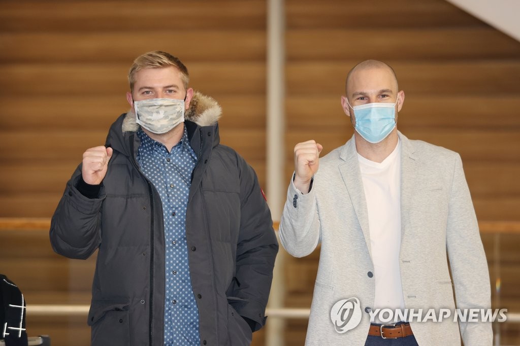 | ▲ Artie Lewicki (L) and Jamie Romak of the SK Wyverns pose for photos after arriving at Incheon International Airport in Incheon, just west of Seoul, on Jan. 16, 2021. (Yonhap) |