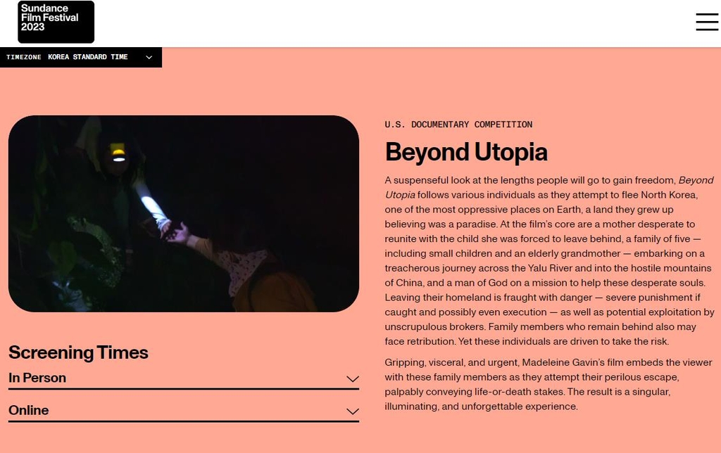 (서울=연합뉴스) 경수현 기자 = 29일(현지시간) 막을 내린 제39회 선댄스 영화제에서 탈북자들의 험난한 탈북 과정을 담은 다큐멘터리 '비욘드 유토피아'가 관객상을 받았다.