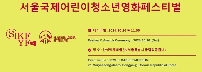 ▲ 2024 서울국제어린이청소년영화페스티벌(Seoul International Kids & Youth Film Festival, SIKYFF)이 오는 26일 오후 2시서울 송파구 올림픽공원 내 한성백제박물관에서 개막한다. 어린이 청소년 영화인 400여 명이 모인 가운데 진행되는 행사에서는 80여 개국에서 출품한 1천여 작품이 경쟁을 벌인다. 국내외 경쟁부문과 국내외 특별부문 등 총 8개 부문에 걸쳐 선정된 수상작은 이날 본 행사에서 만나볼 수 있다. 자세한 정보 및 예매, 참여 신청은 공식 홈페이지(https://sikyff.com), 공식 인스타그램, 공식 페이스북을 통해 가능하다. (서울=연합뉴스)