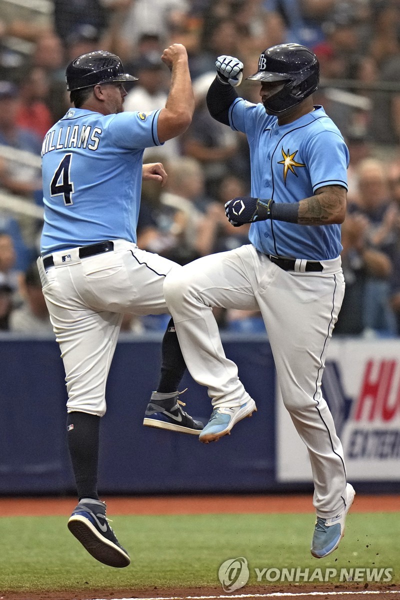 류현진은 1회 선두타자 얀디 디아스에게 몸쪽 포심 패스트볼을 던졌다가 좌월 홈런을 맞았다.