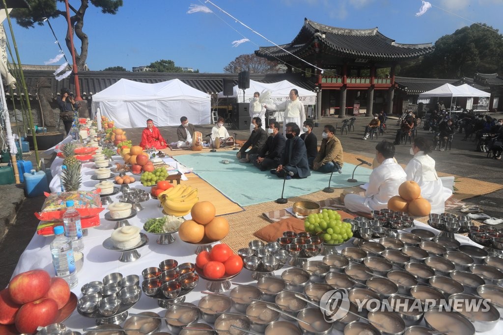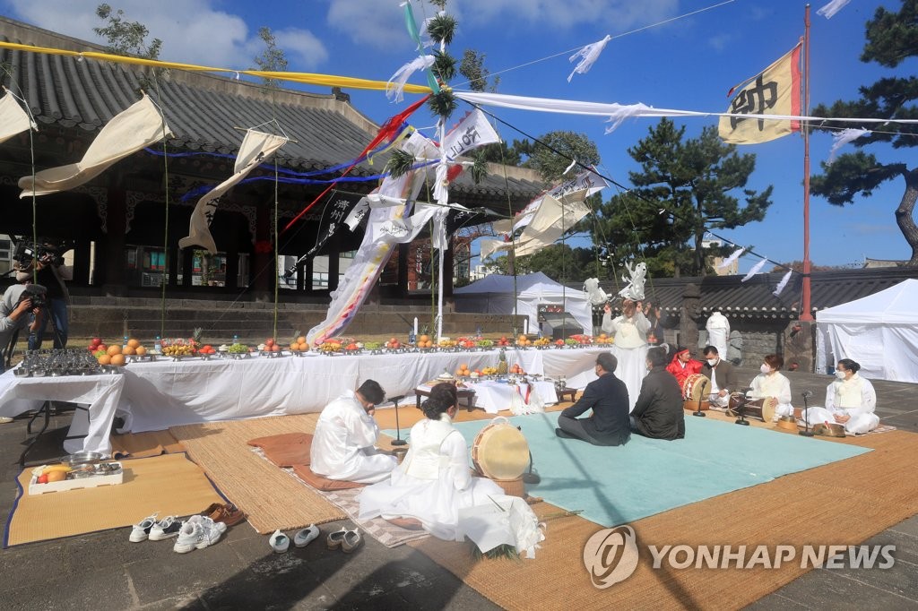 | ▲ 신축항쟁 120주년 추모굿 (제주=연합뉴스) 박지호 기자 = 7일 오전 제주시 제주목관아에서 '신축항쟁 희생자 모두를 위한 장두 추모굿'이 열리고 있다. 2021.11.7 jihopark@yna.co.kr |