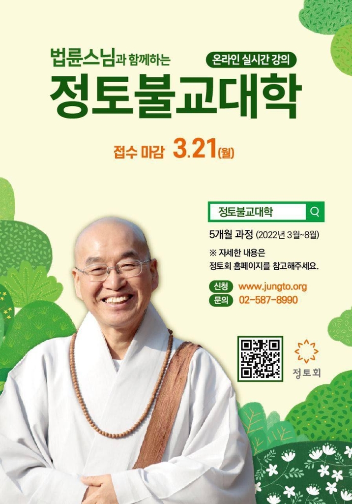 정토불교대학은 3월 27일∼8월 20일 매주 화·목 저녁 8시 온라인에서 열린다. 법륜스님이 '실천적 불교사상'과 '인간 붓다의 삶', '불교와 사회' 등을 주제로 강의하고, 수행도 지도한다. 수강신청과 관련한 자세한 사항은 정토회 홈페이지(www.jungto.org)를 참고하면 된다. 문의 정토회(☎ 02-587-8990).