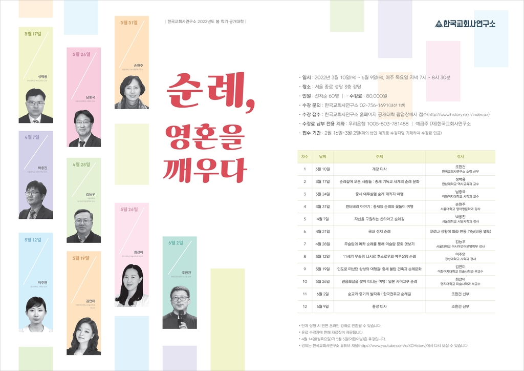 (서울=연합뉴스) 양정우 기자 = ▲ 한국교회사연구소, 순례 주제로 봄학기 공개대학 = 한국교회사연구소(소장 조한건 신부)는 '순례, 영혼을 깨우다'를 주제로 2022년도 봄학기 공개대학을 개최한다고 9일 밝혔다.