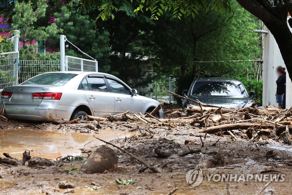 ▲ 토사에 파묻힌 차량 (경기 광주=연합뉴스) 홍기원 기자 = 중부지방에 내린 많은 비로 산사태가 발생한 경기도 광주시 남한산성면 검복리 마을의 지난달 10일 모습.