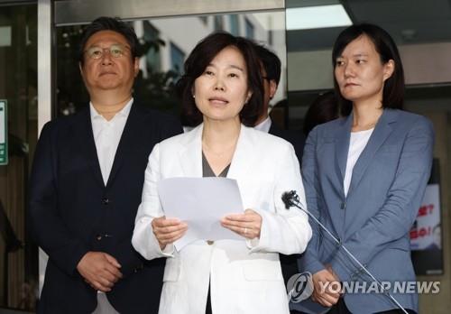 ▲ Kim Eun-kyung (C) speaks to reporters at the National Assembly in Seoul on Aug. 3, 2023. (Yonhap)