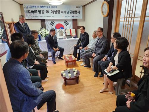 | ▲ Lee Keun-won (2nd from L, back), head of the defense ministry's Agency for KIA Recovery and Identification, speaks with family members of the late Ssg. Lee Seong-kyun, killed during the 1950-53 Korean War, in a ceremony marking his return at Goseong, 154 kilometers northeast of Seoul, in this photo provided by the ministry. (PHOTO NOT FOR SALE) (Yonhap) |