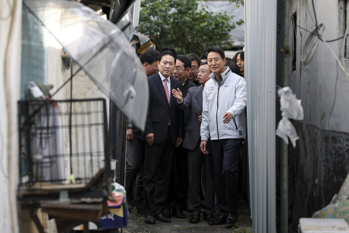 Jang Dong-hyeok (L), chief of the main opposition People Power Party, and Seoul Mayor Oh Se-hoon (R) inspect the site of a redevelopment area in Seoul's Nowon Ward on Oct. 24, 2025. (Pool photo) (Yonhap)