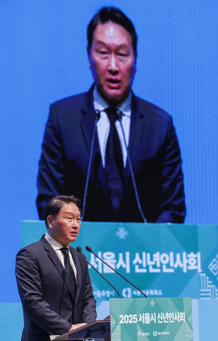 Chey Tae-won (R), chief of the Korea Chamber of Commerce and Industry (KCCI), addresses a new year meeting of the Seoul metropolitan government at the KCCI headquarters in Seoul on Jan. 6, 2025. (Yonhap)