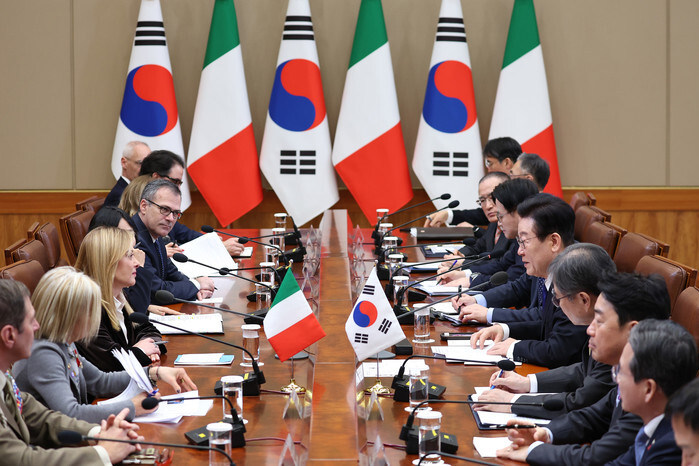 South Korean President Lee Jae Myung (4th from R) holds summit talks with Italian Prime Minister Giorgia Meloni (3rd from L) at the presidential office Cheong Wa Dae in Seoul on Jan. 19, 2026. (Yonhap)